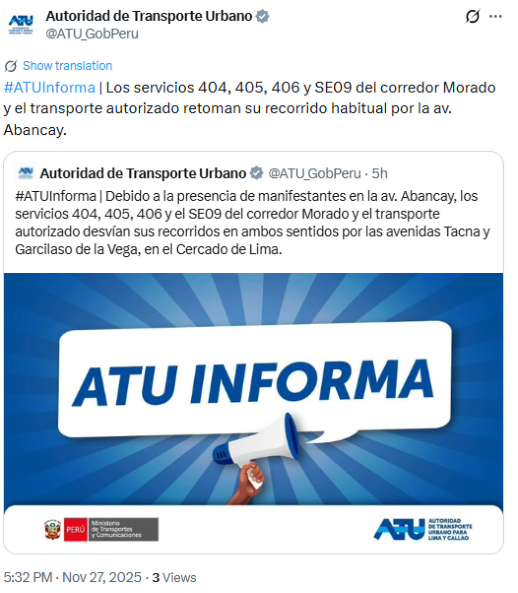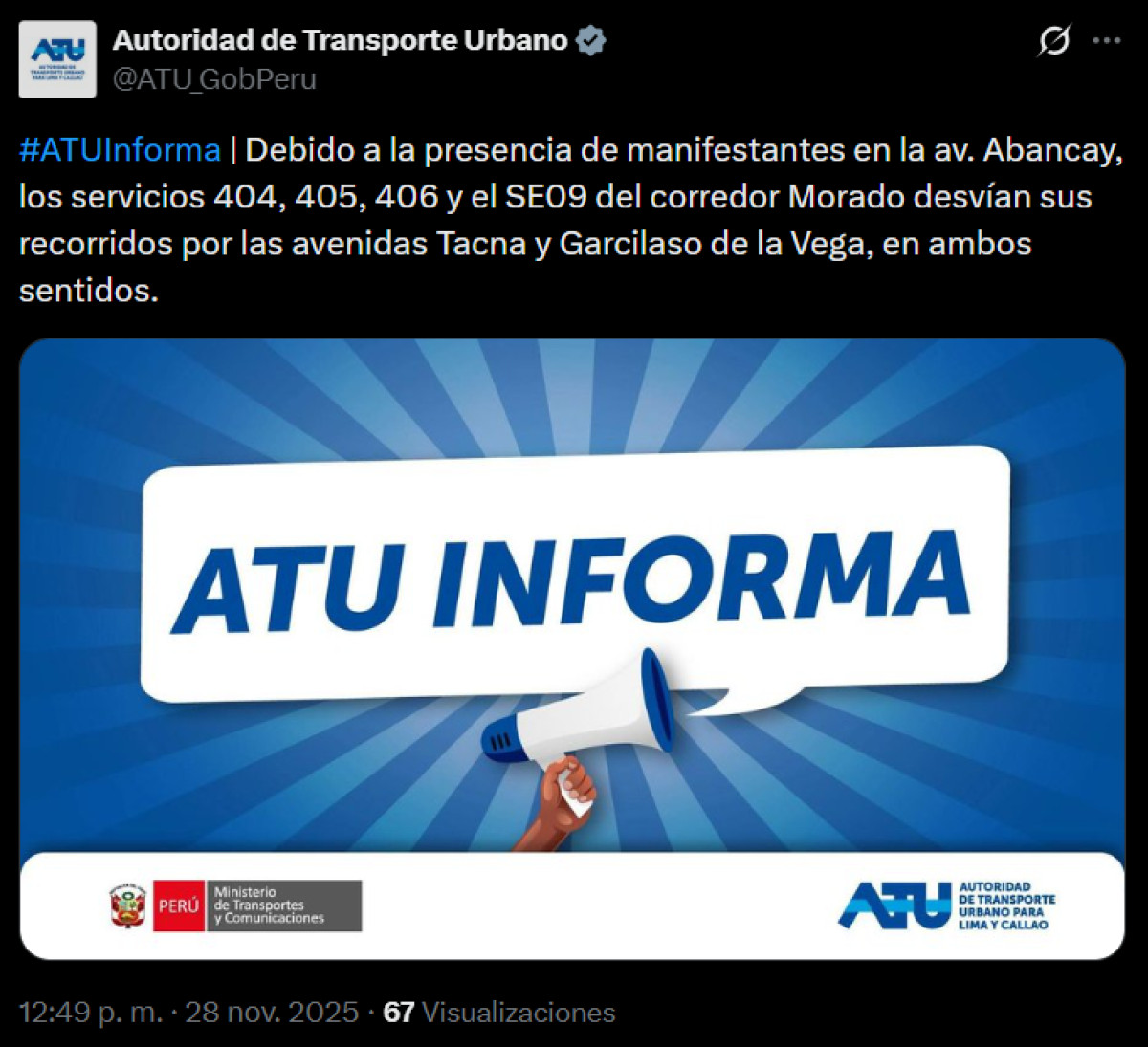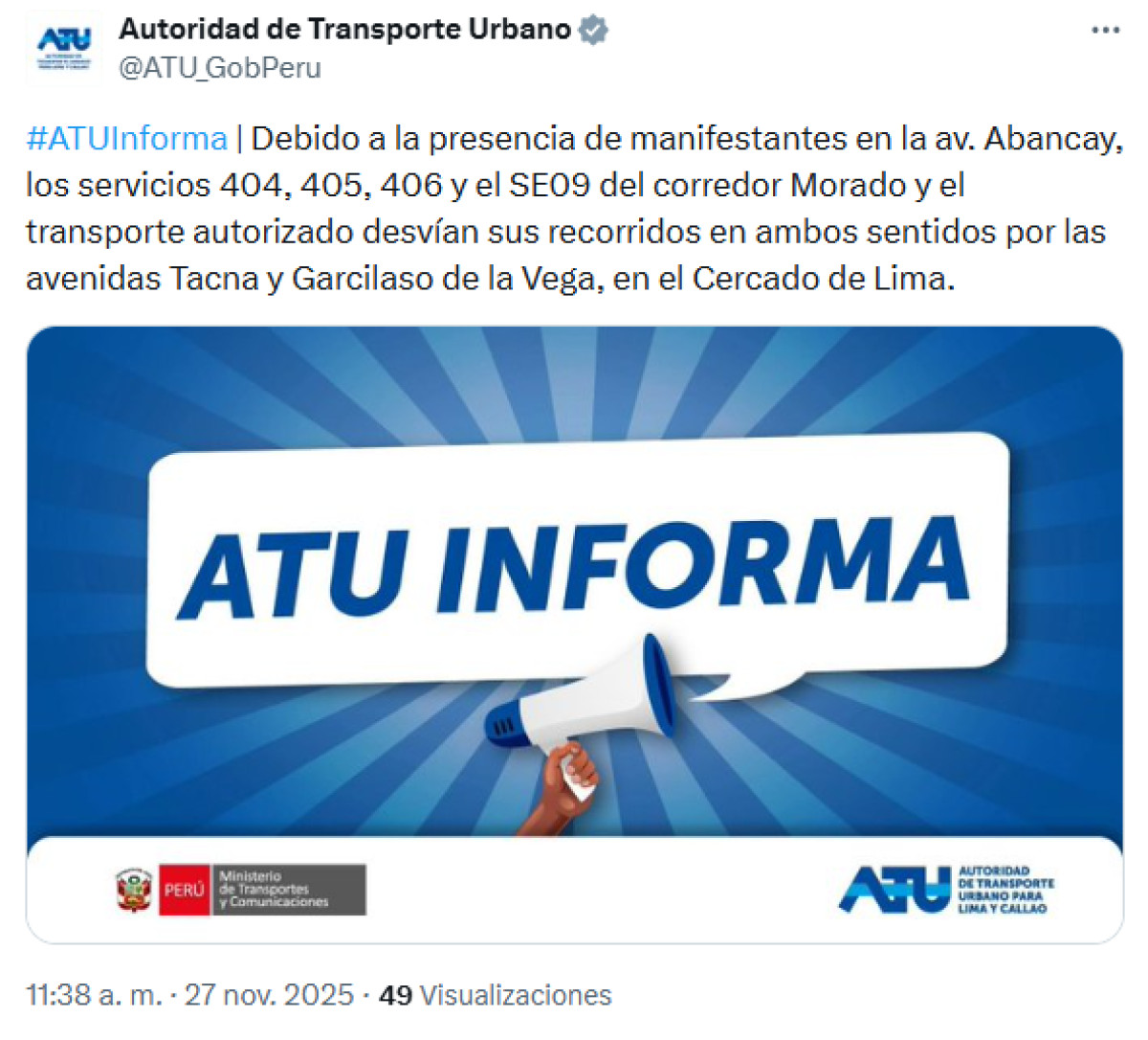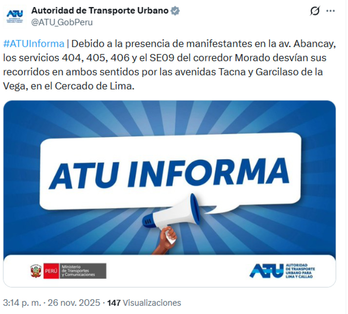 ATU informó sobre desvíos en X. ''Debido a la presencia de manifestantes en la av. Abancay, los servicios 404, 405, 406 y el SE09 del corredor Morado desvían sus recorridos en ambos sentidos por las avenidas Tacna y Garcilaso de la Vega, en el Cercado de Lima'', escribió la entidad.