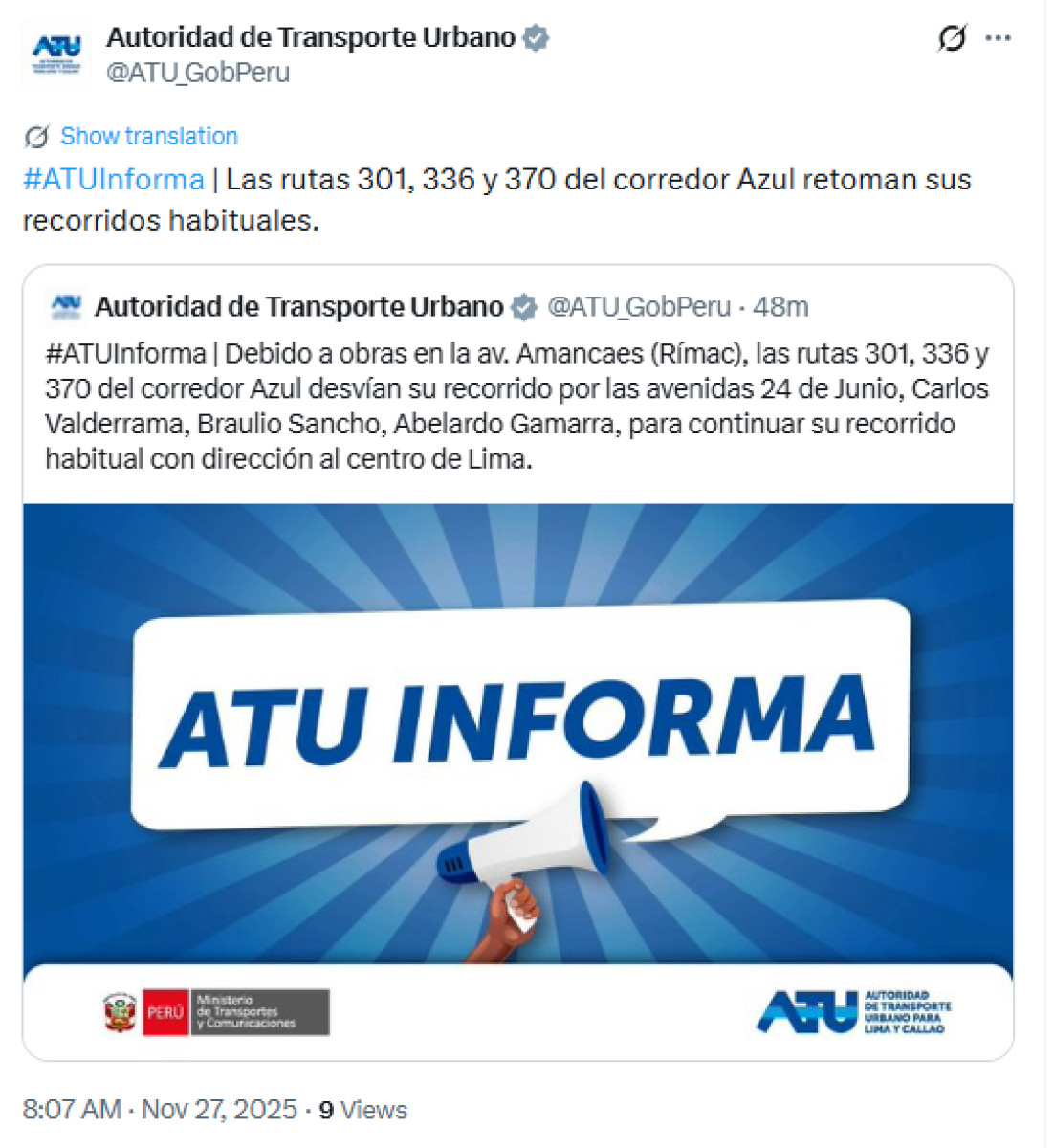 ATU informó en su cuenta de X sobre los desvíos del corredor. Alrededor de las 7 a.m., debido a obras en la av. Amancaes (Rímac), las rutas 301, 336 y 370 del corredor Azul desviaron su recorrido por las avenidas 24 de Junio, Carlos Valderrama, Braulio Sancho, Abelardo Gamarra, para continuar su recorrido habitual con dirección al centro de Lima. Una hora después, la entidad indicó: ''Las rutas 301, 336 y 370 del corredor Azul retoman sus recorridos habituales''.