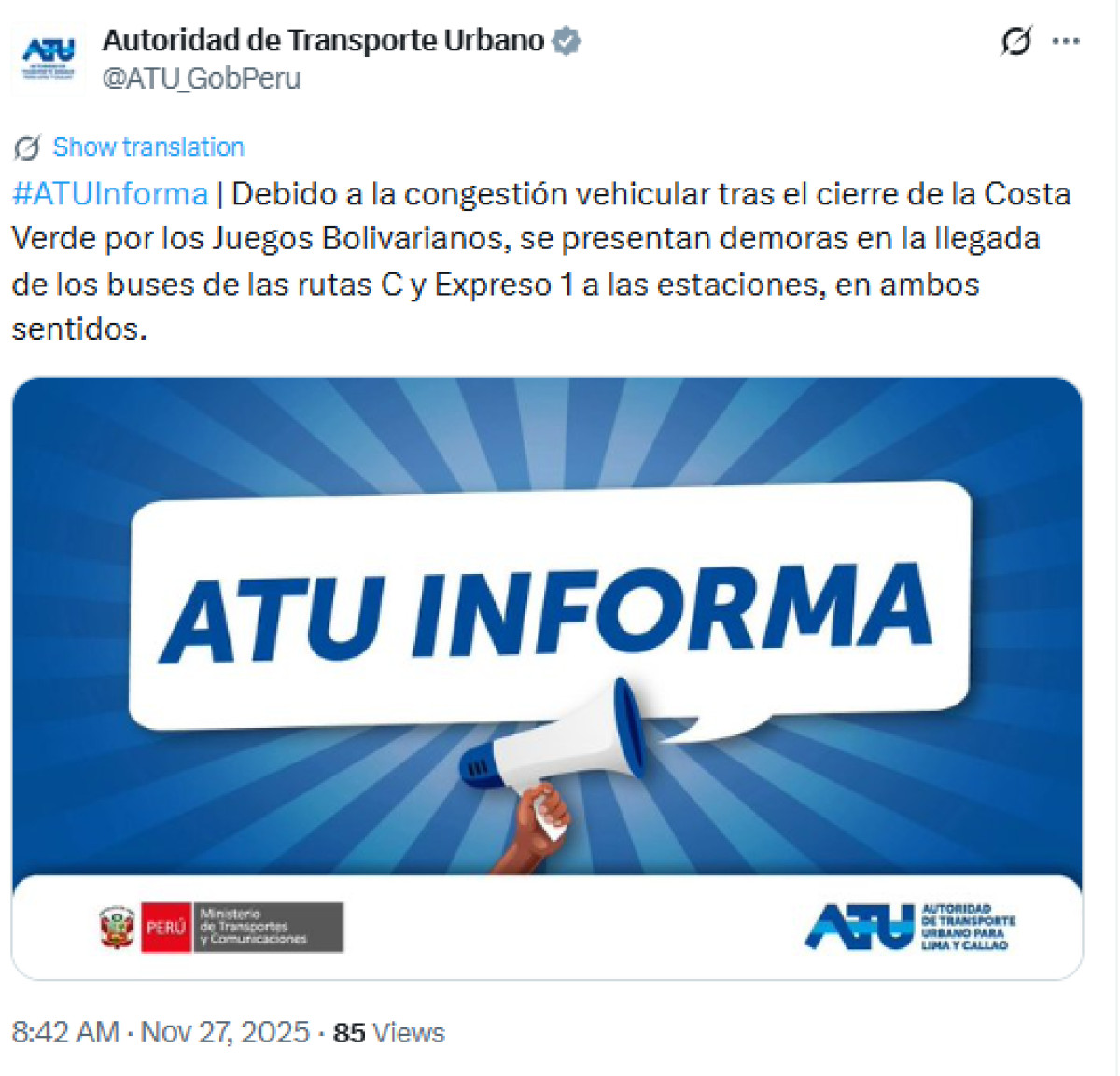 ATU informó en X (antes Twitter): ''Debido a la congestión vehicular tras el cierre de la Costa Verde por los Juegos Bolivarianos, se presentan demoras en la llegada de los buses de las rutas C y Expreso 1 a las estaciones, en ambos sentidos''.