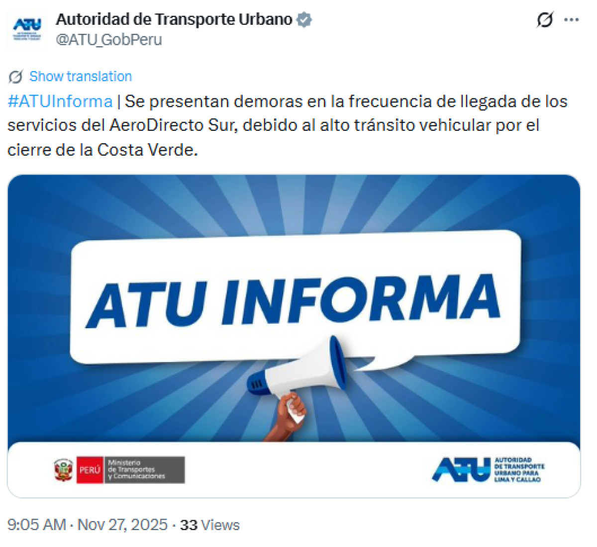Según lo transmitido por ATU, ''se presentan demoras en la frecuencia de llegada de los servicios del AeroDirecto Sur, debido al alto tránsito vehicular por el cierre de la Costa Verde''.