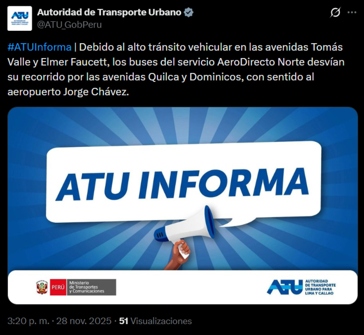 En su cuenta de X, ATU precisó: ''Debido al alto tránsito vehicular en las avenidas Tomás Valle y Elmer Faucett, los buses del servicio AeroDirecto Norte desvían su recorrido por las avenidas Quilca y Dominicos, con sentido al aeropuerto Jorge Chávez''. Además, informaron que los paraderos Aduanas y Bertello quedan deshabilitados temporalmente.
