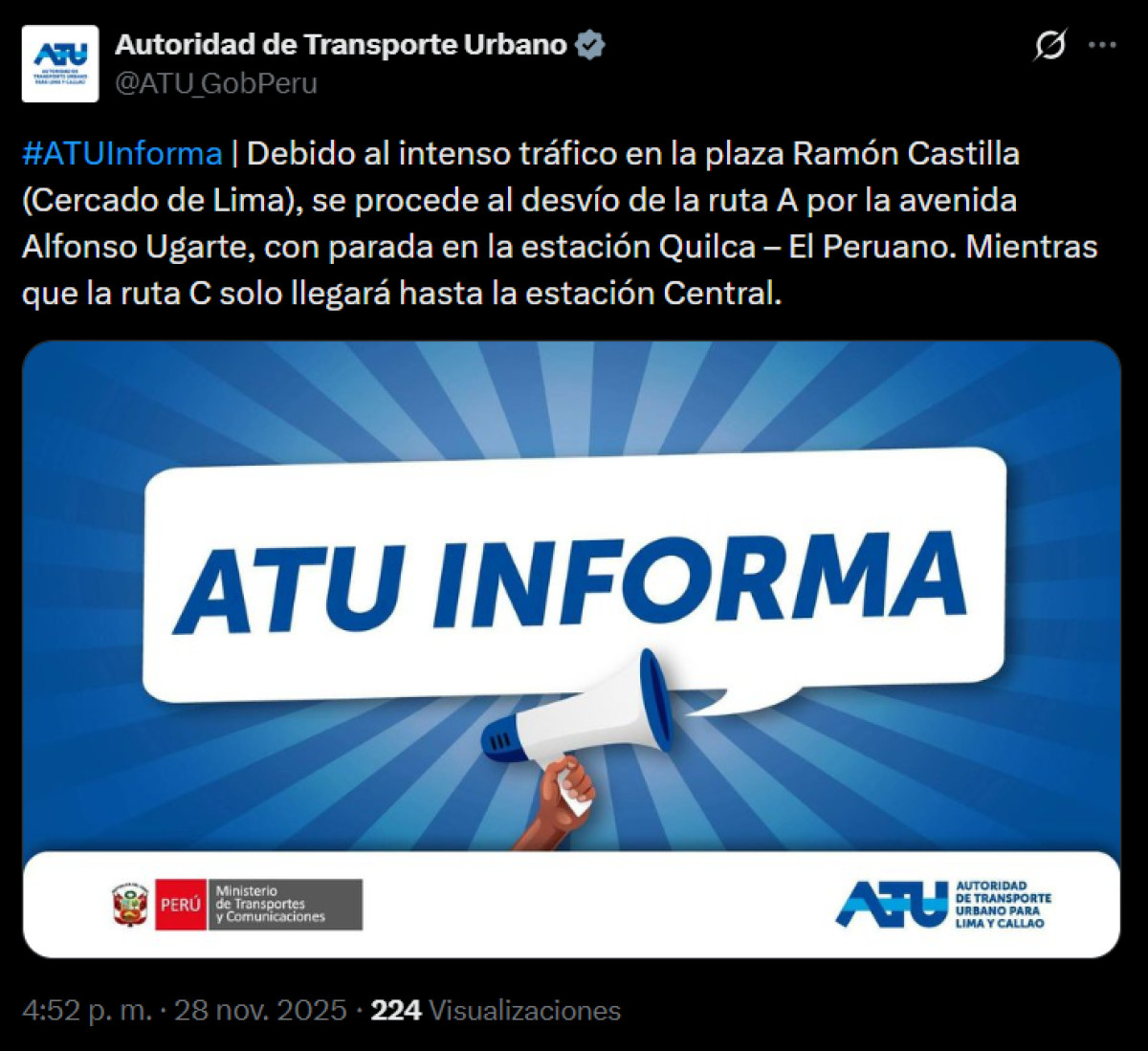En X, ATU informó: ''Debido al intenso tráfico en la plaza Ramón Castilla (Cercado de Lima), se procede al desvío de la ruta A por la avenida Alfonso Ugarte, con parada en la estación Quilca – El Peruano. Mientras que la ruta C solo llegará hasta la estación Central''.