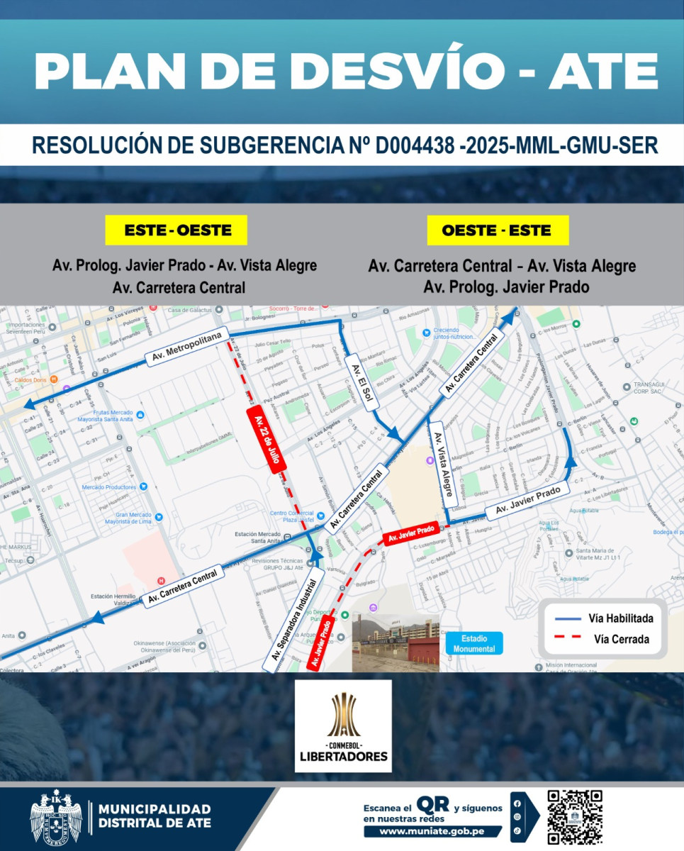 Debido al cierre de vías por el partido entre Flamengo y Palmeiras, el plan de la comuna de Ate incluye ajustes en los sentidos Este–Oeste y Oeste–Este, especialmente en avenidas como Prolongación Javier Prado, Vista Alegre y Carretera Central.