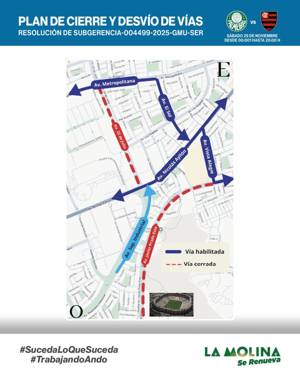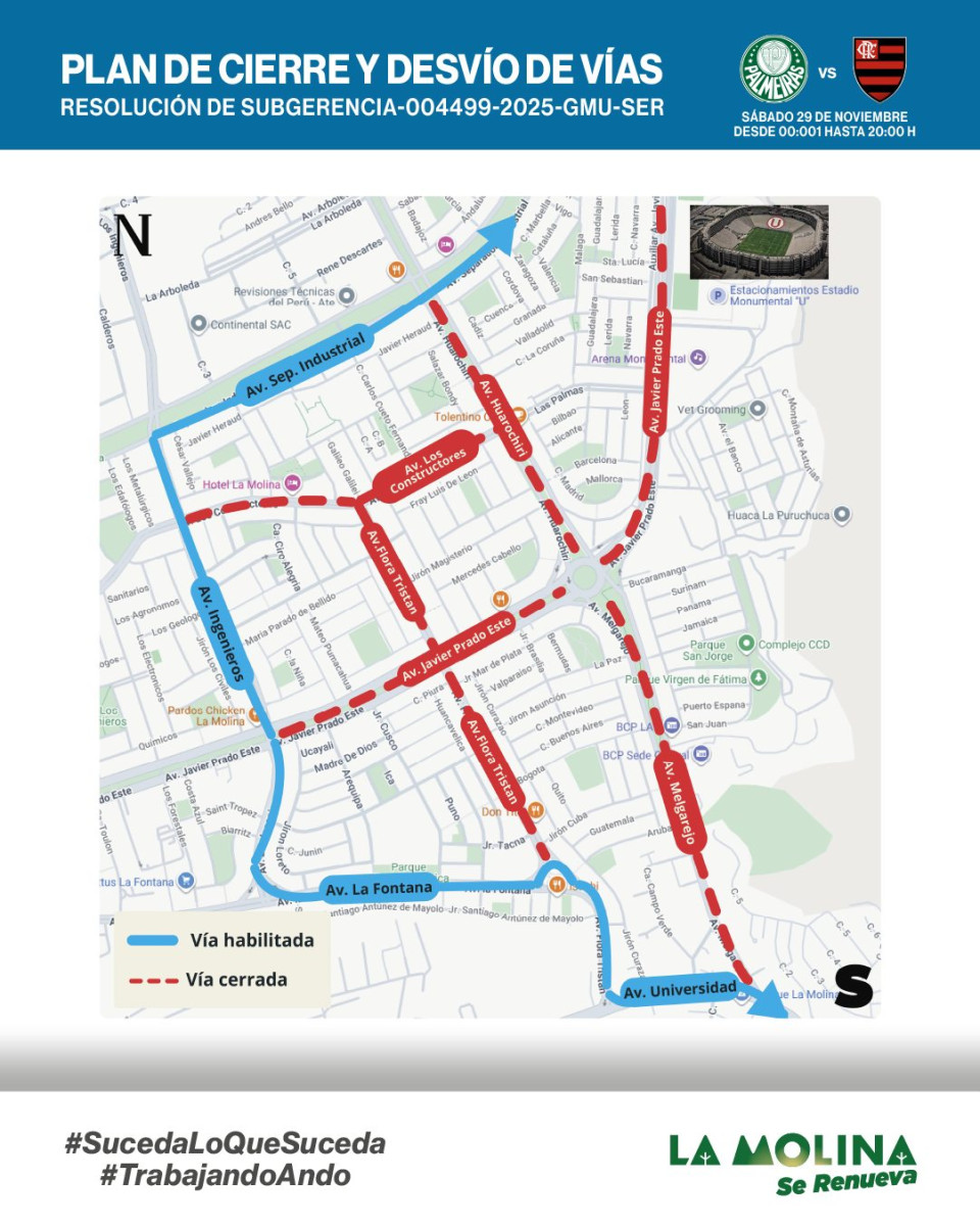 Debido a la final de la Copa Libertadores, entre Palmeiras y Flamengo, que se realiza en Lima, la Policía Nacional informó que aplicará un plan de desvío vehicular en las inmediaciones del Estadio Monumental este sábado 29 de noviembre. Se cerrarán las avenidas Los Constructores, Huarochirí, Javier Prado Este, Flora Tristán y Melgarejo. Las vías habilitadas son las avenidas La Fontana, Ingenieros, La Universidad y Separadora Industrial.