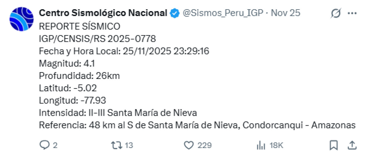 A las 23:29 p.m. del martes 25 de noviembre, Amazonas registró un sismo de magnitud 4,1. El epicentro se dio a 148 km al sur de Santa María de Neiva, Condorcanqui, según el Centro Sismológico Nacional.