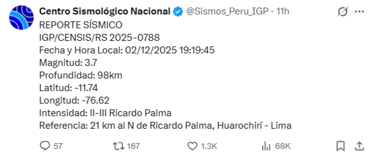 Un temblor de magnitud 3,7 se registró a las 7:19 p.m. a 21 kilómetros al norte de Ricardo Palma, Huarochirí, Lima, el día de ayer, 2 de diciembre. El movimiento telúrico tuvo una profundidad de 98 kilómetros, según informó el Instituto Geofísico del Perú (IGP) vía Twitter.