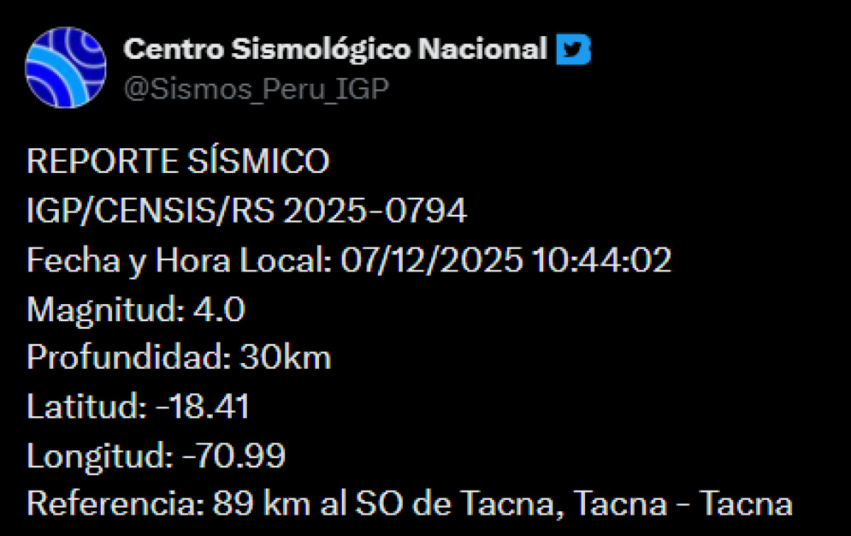 Un temblor de magnitud 4,0 se registró a las 10:44 a.m. a 30 kilómetros al suroeste de Tacna. El sismo de HOY, 7 de diciembre, tuvo una profundidad de 30 kilómetros.
