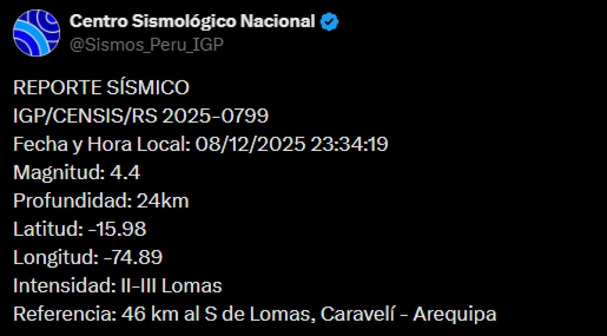 A las 23:34 p.m. de este lunes 8 de diciembre, la ciudad de Arequipa registró un sismo de magnitud 4,4. El epicentro se dio a 46 km al sur de Lomas, Caraveli, según el Centro Sismológico Nacional.