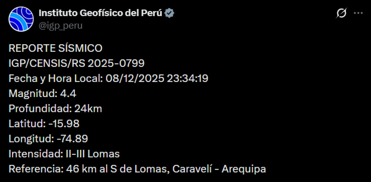 Un temblor de magnitud 4,4 se registró a las 11:34 p. m. a 46 kilómetros al sur de Lomas, Caravelí, Arequipa. El temblor del 8 de diciembre de 2025, se registró a una profundidad de 24 kilómetros, según informó el Instituto Geofísico del Perú (IGP) vía Twitter. Recuerda tener siempre lista una mochila de emergencia para estar preparado ante un desastre natural.