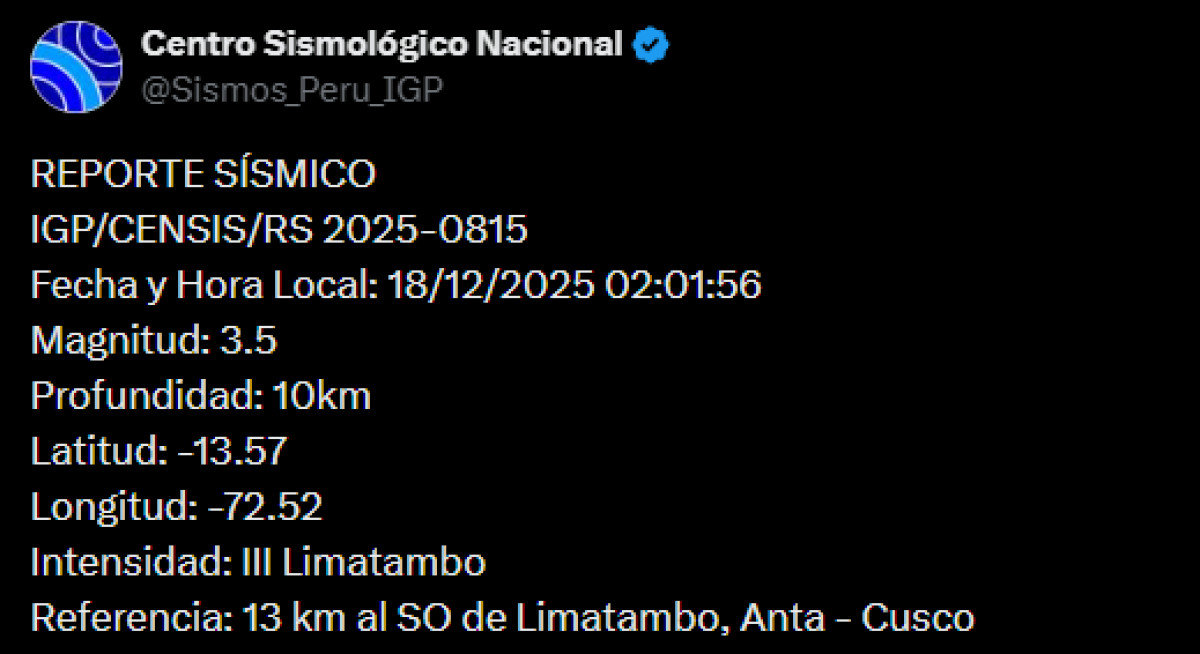 A las 02:01 a.m. de este jueves 18 de diciembre, Cusco registró un sismo de magnitud 3,5. El epicentro se dio a 13 km al suroeste de Limatambo, Anta, según el Centro Sismológico Nacional.