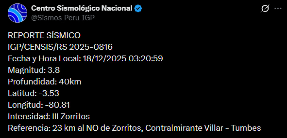 Un temblor de magnitud 3,8 se registró a las 03:20 a. m. a 23 kilómetros al noroeste de Zorritos, Contralmirante Villar, Tumbes. El temblor de este 18 de diciembre, se registró a una profundidad de 40 kilómetros, según informó el Instituto Geofísico del Perú (IGP) vía Twitter.