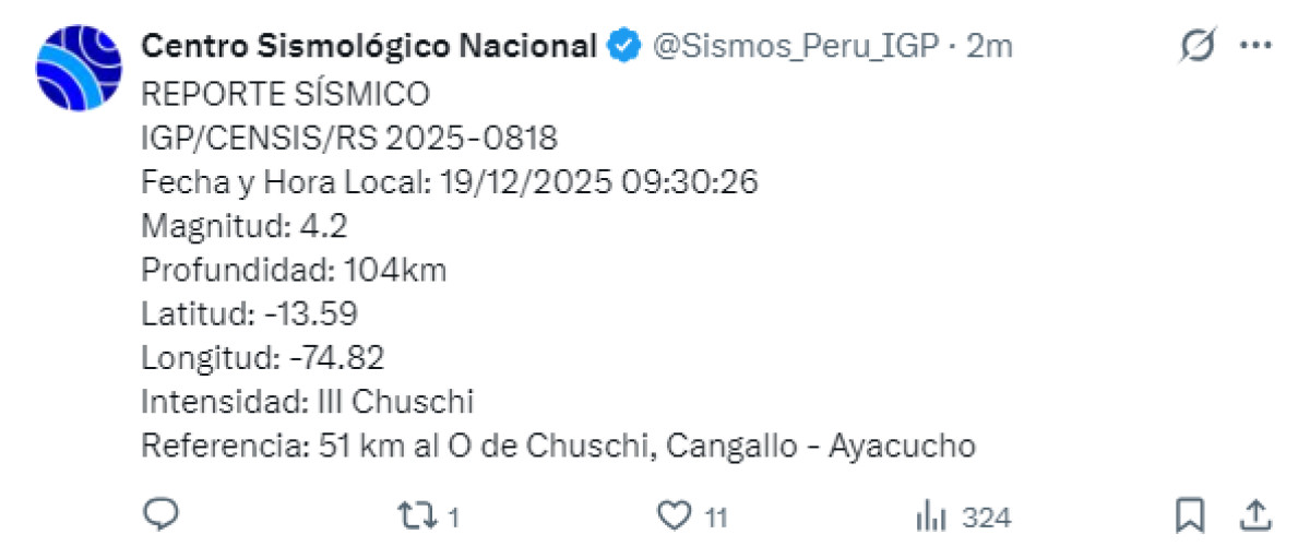 Un temblor de magnitud 4,2 se registró a las 09:30 a. m. a 51 kilómetros al oeste de Chuschi, Cangallo, Ayacucho. El temblor del 19 de diciembre de 2025, se registró a una profundidad de 104 kilómetros, según informó el Instituto Geofísico del Perú (IGP) vía Twitter. Recuerda tener siempre lista una mochila de emergencia para estar preparado ante un desastre natural.