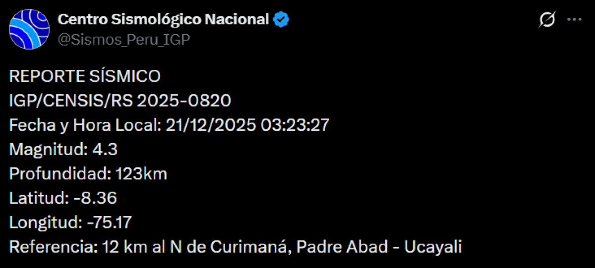 Un sismo de magnitud 4,3 se registró a las 03:23 a. m. a 12 kilómetros al norte de Curimaná, Padre Abad - Ucayali. El temblor del 21 de diciembre de 2025, se registró a una profundidad de 123 kilómetros, según informó el Instituto Geofísico del Perú (IGP) vía Twitter. Recuerda tener siempre lista una mochila de emergencia para estar preparado ante un desastre natural.