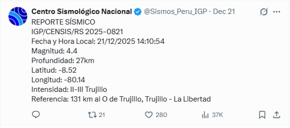 Un temblor de magnitud 4,4 se registró a las 14:10 p.m. a 131 kilómetros al oeste de Trujillo, La Libertad. El temblor del 21 de diciembre de 2025, se registró a una profundidad de 27 kilómetros, según informó el Instituto Geofísico del Perú (IGP) vía Twitter. Recuerda tener siempre lista una mochila de emergencia para estar preparado ante un desastre natural.
