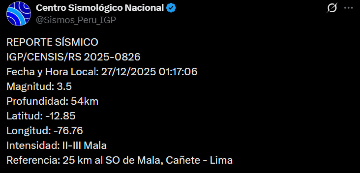 Un sismo de magnitud 3,5 se registró a las 01:17 a. m. a 25 kilómetros al suroeste de Mala - Cañete, Lima. El temblor del 27 de diciembre de 2025, se registró a una profundidad de 54 kilómetros, según informó el Instituto Geofísico del Perú (IGP) vía Twitter. Recuerda tener siempre lista una mochila de emergencia para estar preparado ante un desastre natural.