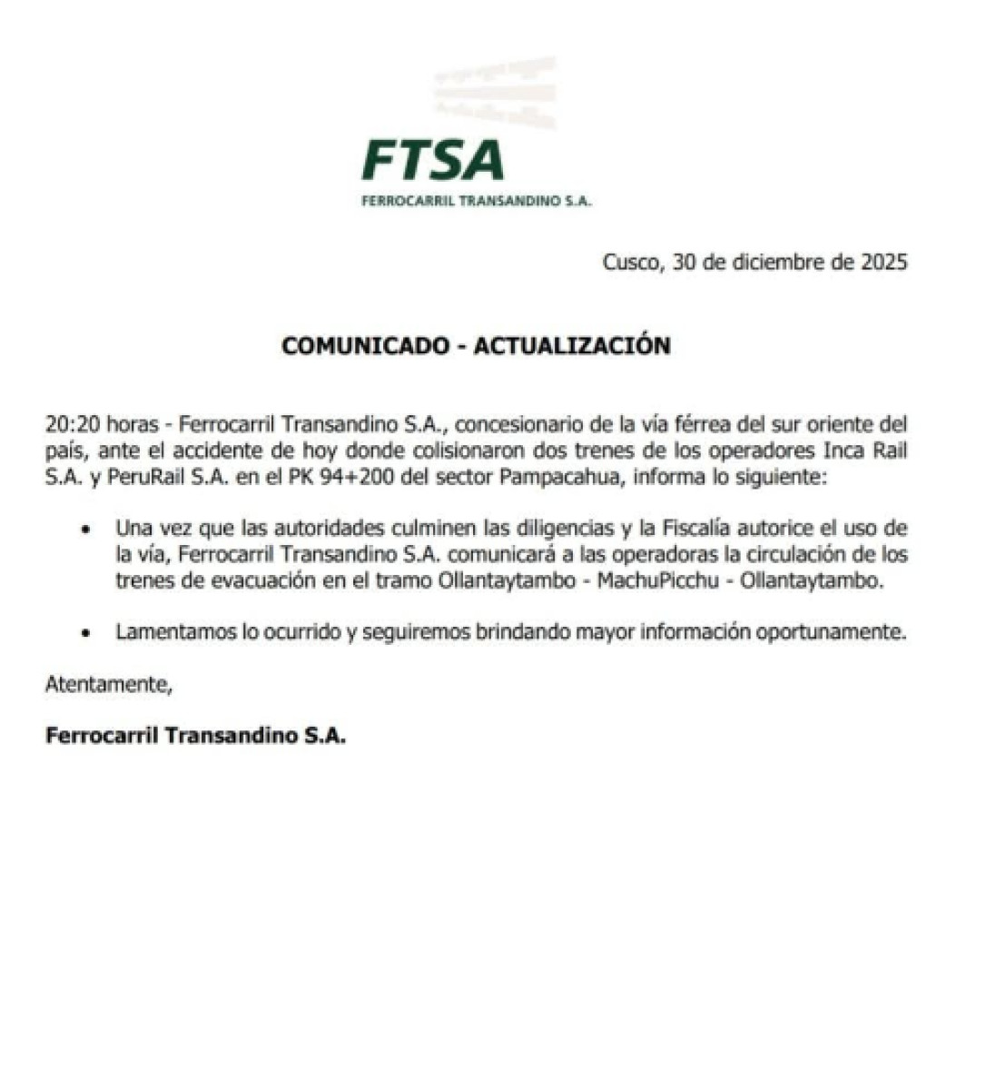 Ferrocarril Transandino S.A., concesionario de la vía férrea del sur oriente, informó que el tránsito ferroviario en el tramo Ollantaytambo–Machu Picchu permanece suspendido tras la colisión entre trenes de Inca Rail y PeruRail en el sector Pampacahua. La empresa precisó que solo se autorizará la circulación de trenes de evacuación una vez que la Fiscalía concluya las diligencias y permita el uso de la vía. Asimismo, lamentó lo ocurrido y señaló que brindará información conforme avance el proceso.