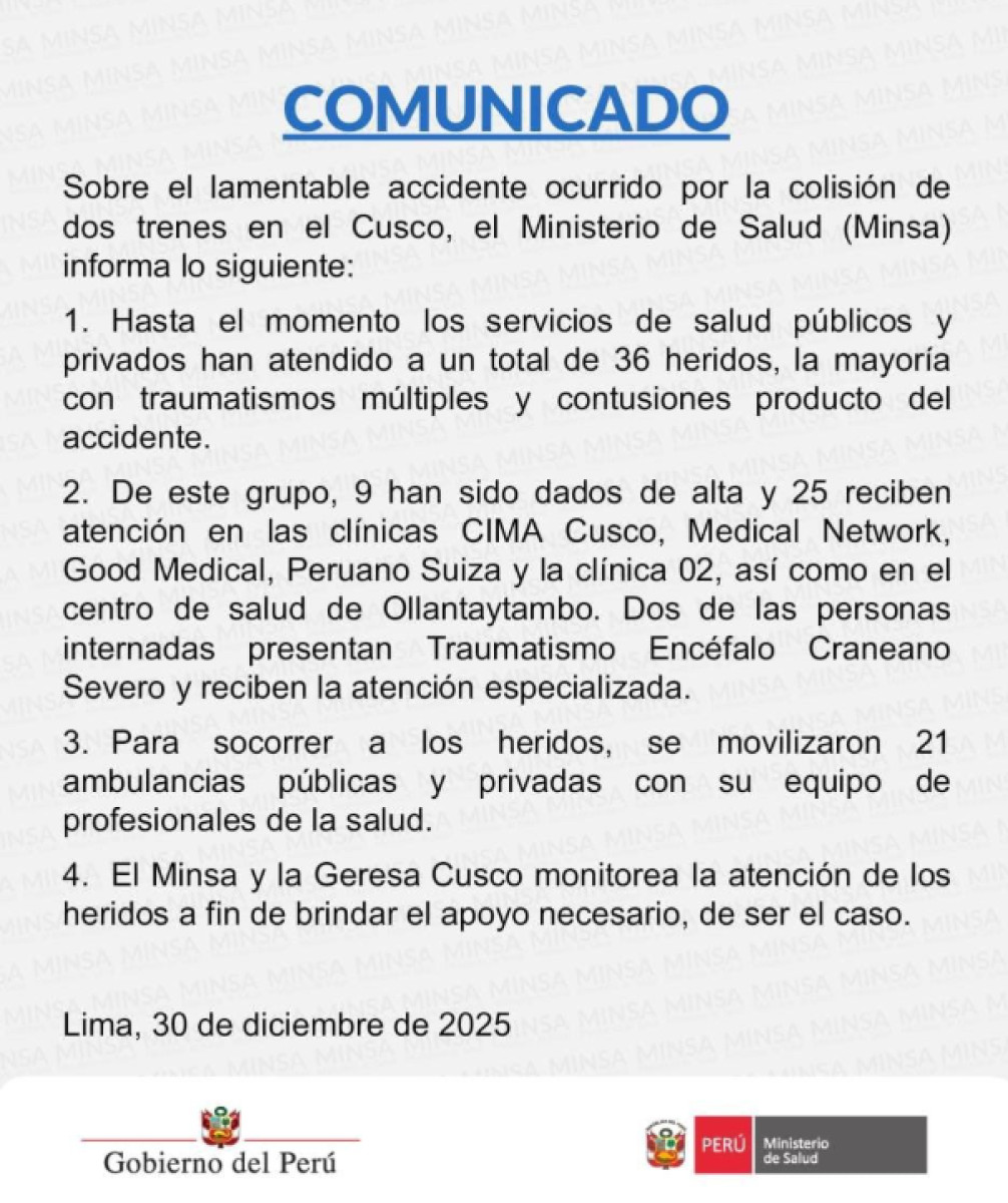 El Ministerio de Salud (Minsa) informó que, por el momento, un total de 36 personas resultaron heridas tras la colisión de dos trenes en Cusco y fueron atendidas en establecimientos públicos y privados. Del total, nueve pacientes ya fueron dados de alta, mientras que 25 continúan bajo observación médica en clínicas de Cusco y en el centro de salud de Ollantaytambo.