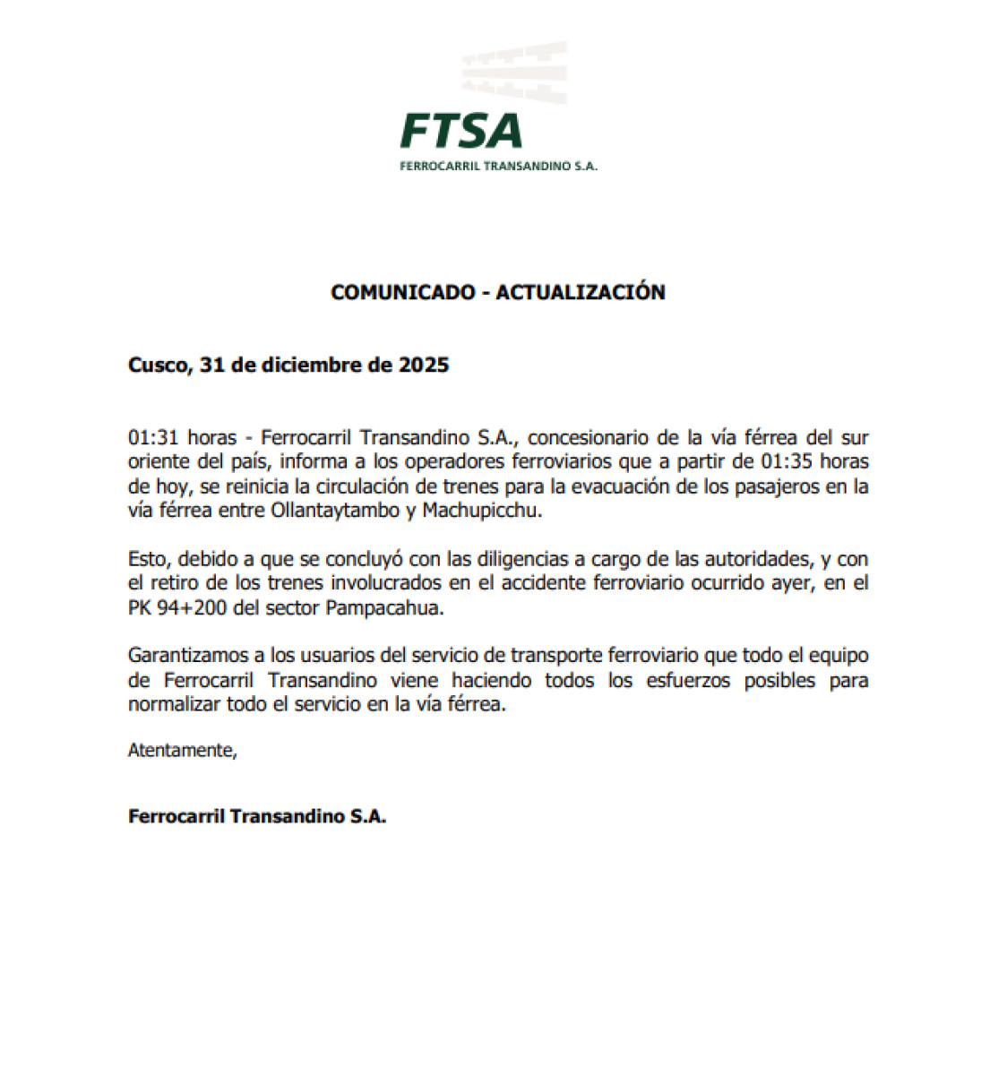 Ferrocarril Transandino S.A. anunció que, desde las 01:35 horas del 31 de diciembre, se reanuda la circulación de trenes entre Ollantaytambo y Machu Picchu para evacuar a los pasajeros. Esto tras concluir las diligencias de las autoridades y retirar los trenes involucrados en el accidente ocurrido el día anterior en el sector Pampacahua. La empresa asegura que continúa trabajando para normalizar completamente el servicio.