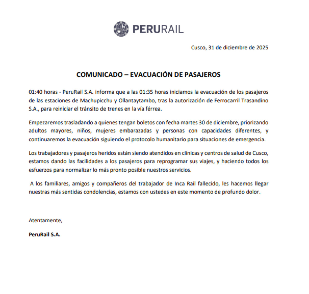 PeruRail inició la evacuación de pasajeros en las estaciones de Machu Picchu y Ollantaytambo desde las 01:35 horas, tras la autorización de Ferrocarril Transandino para reiniciar el tránsito de trenes. Se prioriza a adultos mayores, niños, mujeres embarazadas y personas con discapacidad. Los heridos reciben atención médica, mientras la empresa facilita la reprogramación de viajes y trabaja para normalizar el servicio. La compañía también expresó sus condolencias por el trabajador de Inca Rail fallecido en el accidente.