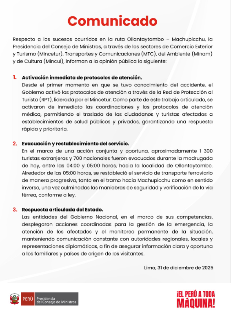 El Ministerio de Transportes y Comunicaciones informó que el servicio ferroviario en la ruta Ollantaytambo–Machu Picchu se viene restableciendo de manera progresiva. Asimismo, precisó que, en coordinación con autoridades locales y regionales, un equipo técnico del MTC verifica la documentación técnica y operativa del servicio, además de recabar información para esclarecer las causas del accidente. En ese marco, indicó que cerca de 12.000 turistas, entre nacionales y extranjeros, fueron evacuados de forma segura hacia Ollantaytambo.