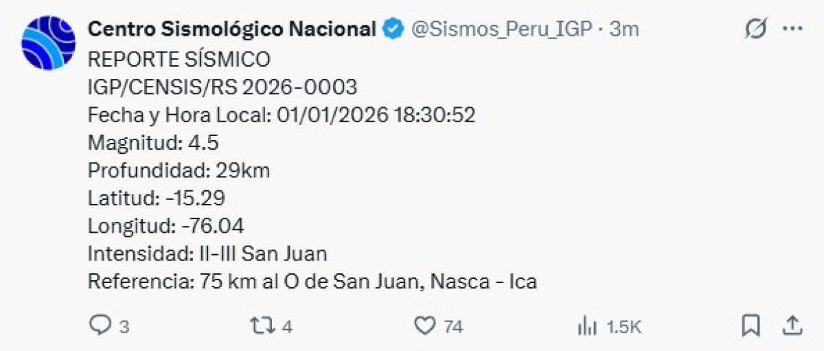 Un nuevo sismo de magnitud 4,5 se registró en San Juan, Ica, en la tarde del 1 de enero, con epicentro ubicado a 75 km al oeste. El Centro Sismológico Nacional informó que el movimiento tuvo una profundidad de 29 km. Hasta el momento, no se ha reportado réplicas ni se ha emitido nueva información por parte del IGP.