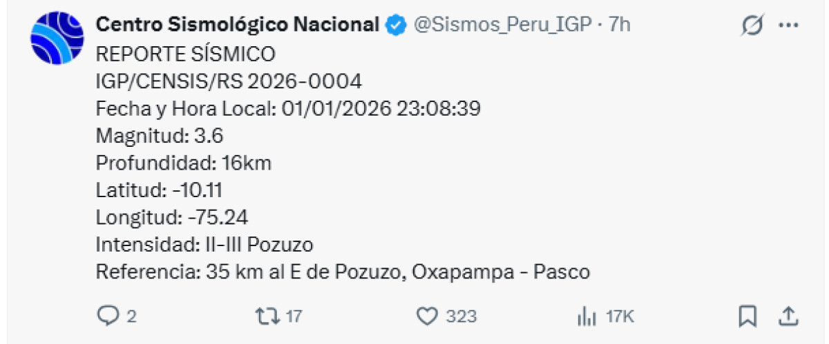 Un temblor de magnitud 3,6 se registró a las 23:08 p. m. a 35 kilómetros al este de Pozuzo, Oxapampa, Pasco. El temblor del 1 de enero de 2026, se registró a una profundidad de 22 kilómetros, según informó el Instituto Geofísico del Perú (IGP) vía Twitter. Recuerda tener siempre lista una mochila de emergencia para estar preparado ante un desastre natural.