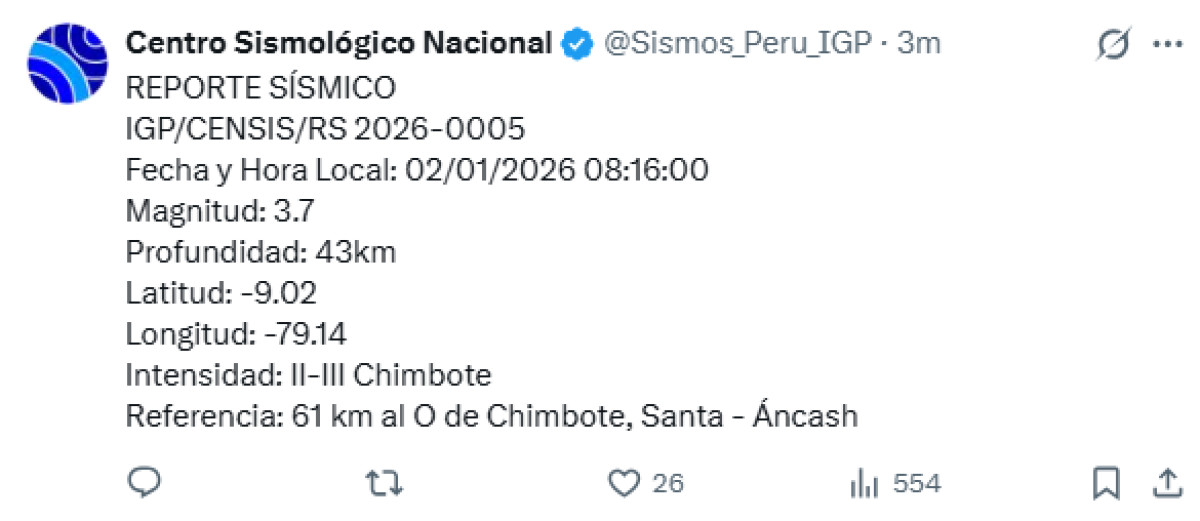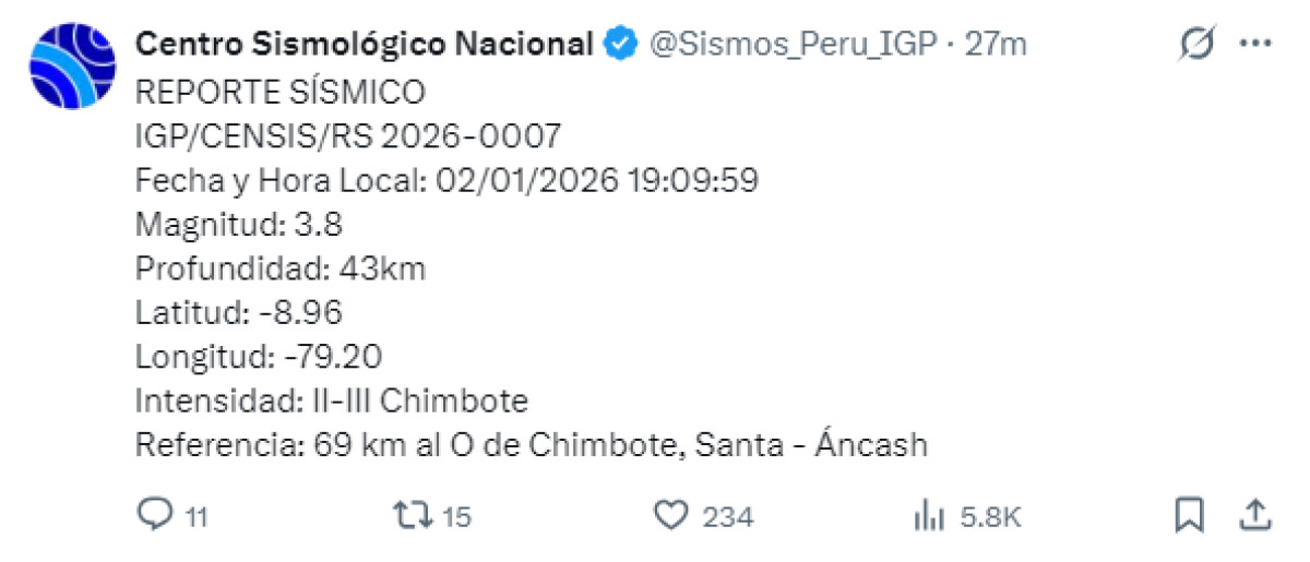 Un temblor de magnitud 3,8 se registró a las 19:09 p. m. a 69 kilómetros al oeste de Chimbote, Áncash. El temblor del 2 de enero del 2026, se registró a una profundidad de 43 kilómetros, según informó el Instituto Geofísico del Perú (IGP) vía Twitter.