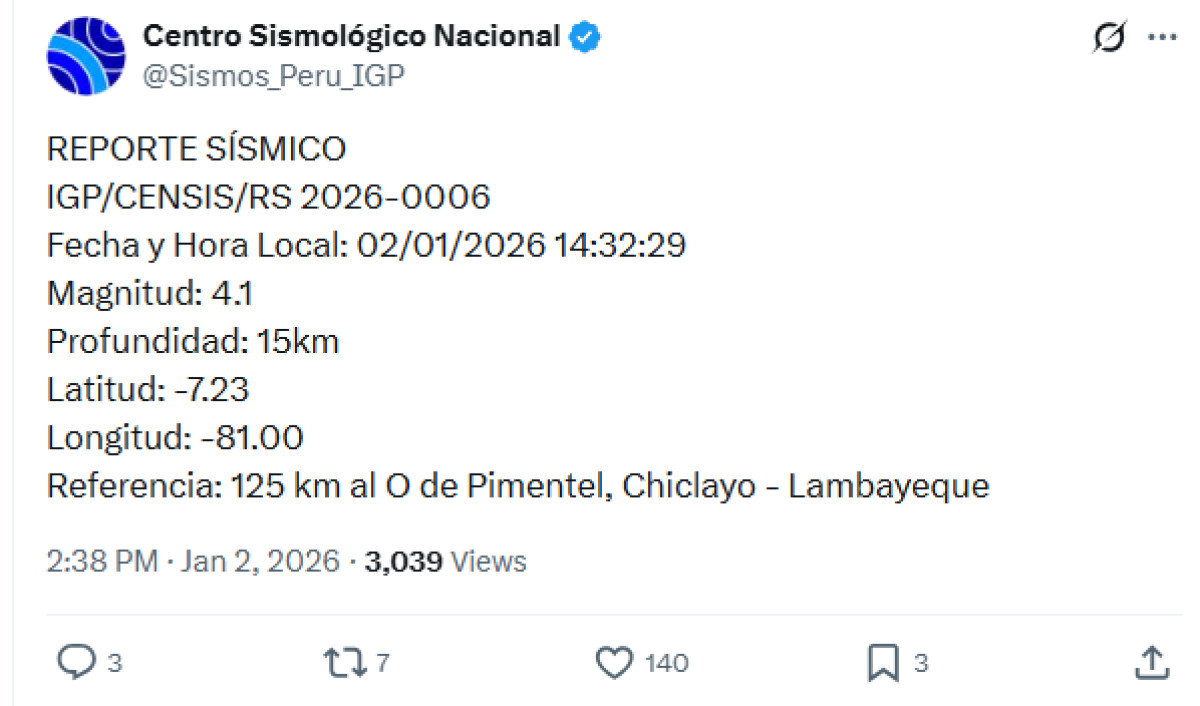 Un temblor de magnitud 4,1 se registró a las 14:32 p. m. a 125 kilómetros al oeste de Pimentel, Chiclayo, Lambayeque. El temblor del 2 de enero de 2026, se registró a una profundidad de 15 kilómetros, según informó el Instituto Geofísico del Perú (IGP) vía Twitter.