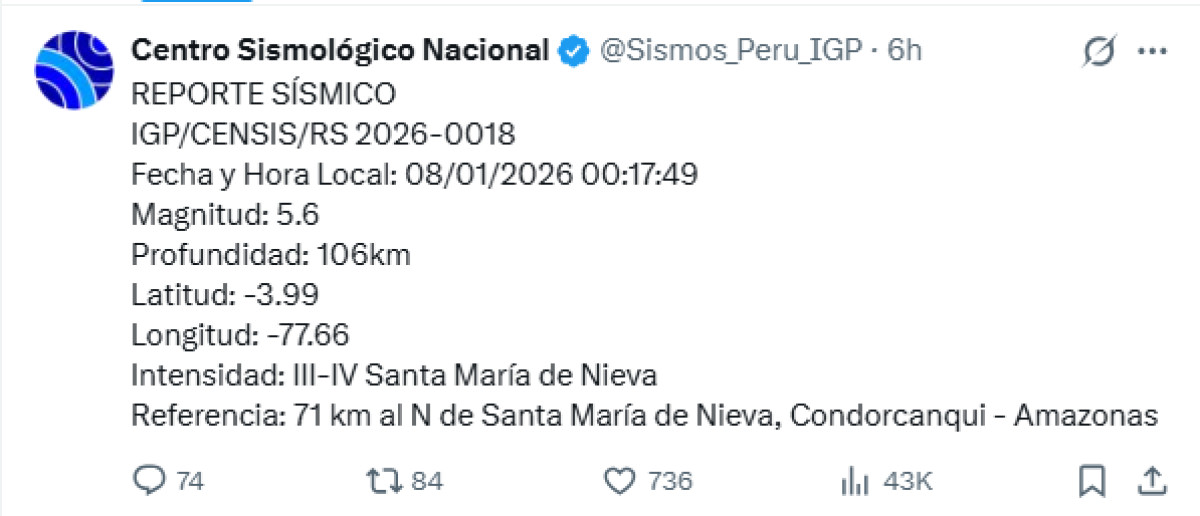 Un temblor de magnitud 5,6 se registró a las 00:17 a. m. a 71 kilómetros al norte de Santa María de Nieva, Condorcanqui, Amazonas. El temblor del 8 de enero de 2025, se registró a una profundidad de 106 kilómetros, según informó el Instituto Geofísico del Perú (IGP) vía Twitter.