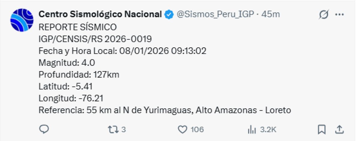 Un temblor de magnitud 4,0 se registró a las 09:13 a. m. a 55 kilómetros al norte de Yurimaguas, Alto Amazonas, Loreto. El temblor del 8 de enero de 2026, se registró a una profundidad de 106 kilómetros, según informó el Instituto Geofísico del Perú (IGP) vía Twitter.