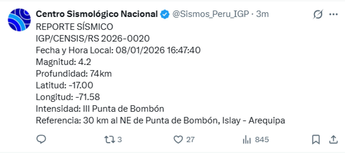 Un temblor de magnitud 4,2 se registró a las 16:47 p. m. a 30 kilómetros al noreste de Punta de Bombón, Islay, Arequipa. El temblor del 8 de enero de 2026, se registró a una profundidad de 74 kilómetros, según informó el Instituto Geofísico del Perú (IGP) vía Twitter.