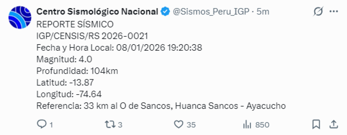 Un temblor de magnitud 4,0 se registró a las 19:20 p. m. a 33 kilómetros al oeste de Sancos, Huanca Sancos, Ayacucho. El temblor del 8 de enero de 2026, se registró a una profundidad de 104 kilómetros, según informó el Instituto Geofísico del Perú (IGP) vía Twitter.