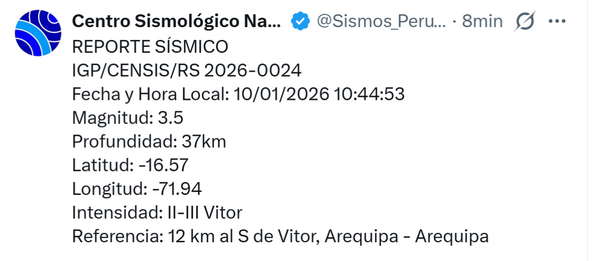 Un sismo de magnitud 3,5 se registró a 12 kilómetros al sur de Vitor, en Arequipa. El movimiento telúrico de este sábado 10 de enero se registró a una profundidad de 37 kilómetros, según informó el Instituto Geofísico del Perú (IGP) vía Twitter.