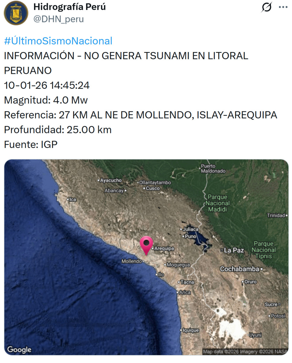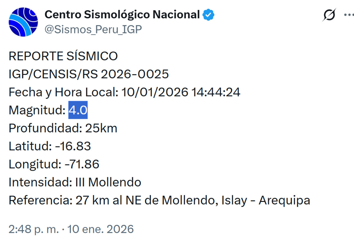 Un sismo de magnitud 4,0 se registró a 27 kilómetros al noroeste de Mollendo, en Islay, Arequipa. El movimiento telúrico de este sábado 10 de enero se registró a una profundidad de 25 kilómetros, según informó el Instituto Geofísico del Perú (IGP) vía Twitter.