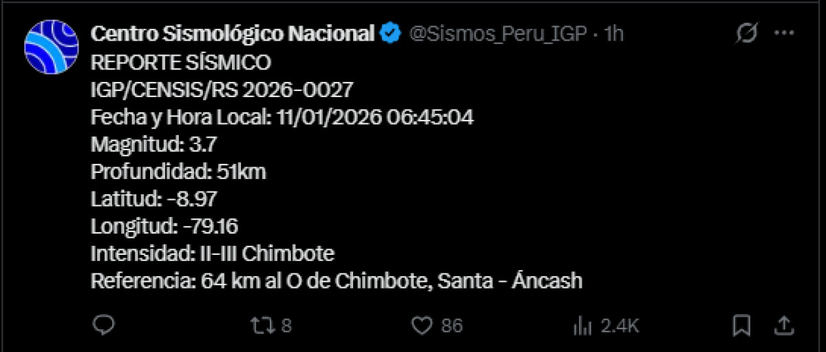 Revisa de qué magnitud fue el temblor de hoy en Perú, según el último reporte del IGP (Instituto Geofísico del Perú) para este domingo 11 de enero.