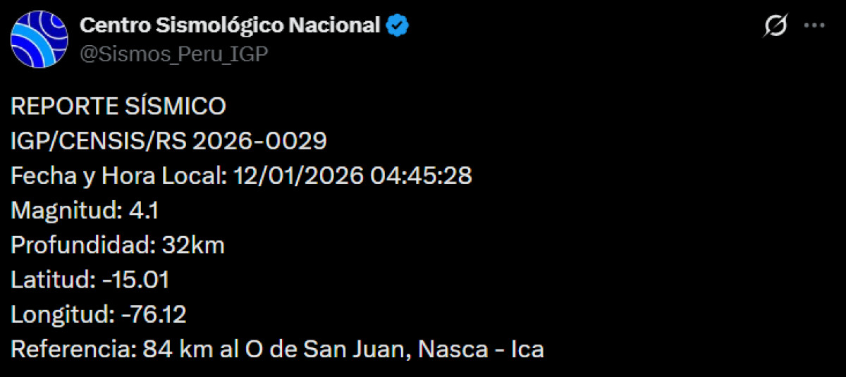 Un sismo de magnitud 4,1 se registró a las 04:45 a. m. a 84 kilómetros al oeste de San Juan, Nasca - Ica. El temblor del lunes 12 de enero de 2026, se registró a una profundidad de 32 kilómetros, según informó el Instituto Geofísico del Perú (IGP) vía X. Recuerda tener siempre lista una mochila de emergencia para estar preparado ante un desastre natural.