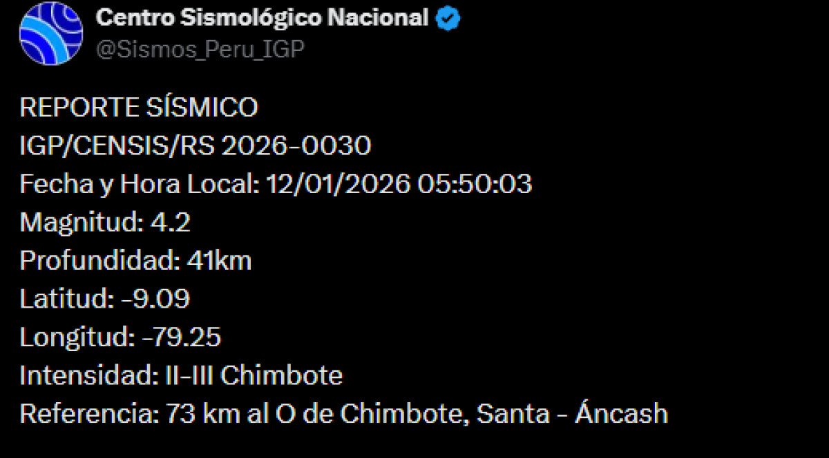 A las 05:50 a.m. de este lunes 12 de enero, Áncash registró un sismo de magnitud 4,2. El epicentro se dio a 73 km al este de Chimbote, Santa, según el Centro Sismológico Nacional.