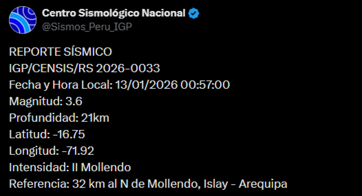 A las 00:57 a.m. de este martes 13 de enero, la ciudad de Arequipa registró un sismo de magnitud 3,6. El epicentro se dio a 32 km al norte de Mollendo, Islay, según el Centro Sismológico Nacional.