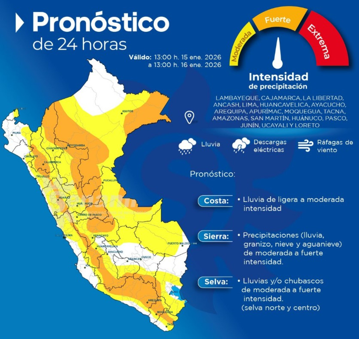 El Senamhi informó que en la selva (norte y sur) se prevén lluvias y en la sierra precipitaciones (lluvia, granizo, nieve y aguanieve), de moderada a fuerte intensidad, acompañadas de descargas eléctricas y ráfagas de viento. Asimismo, se espera lluvis de ligera a moderada intensidad en la costa.