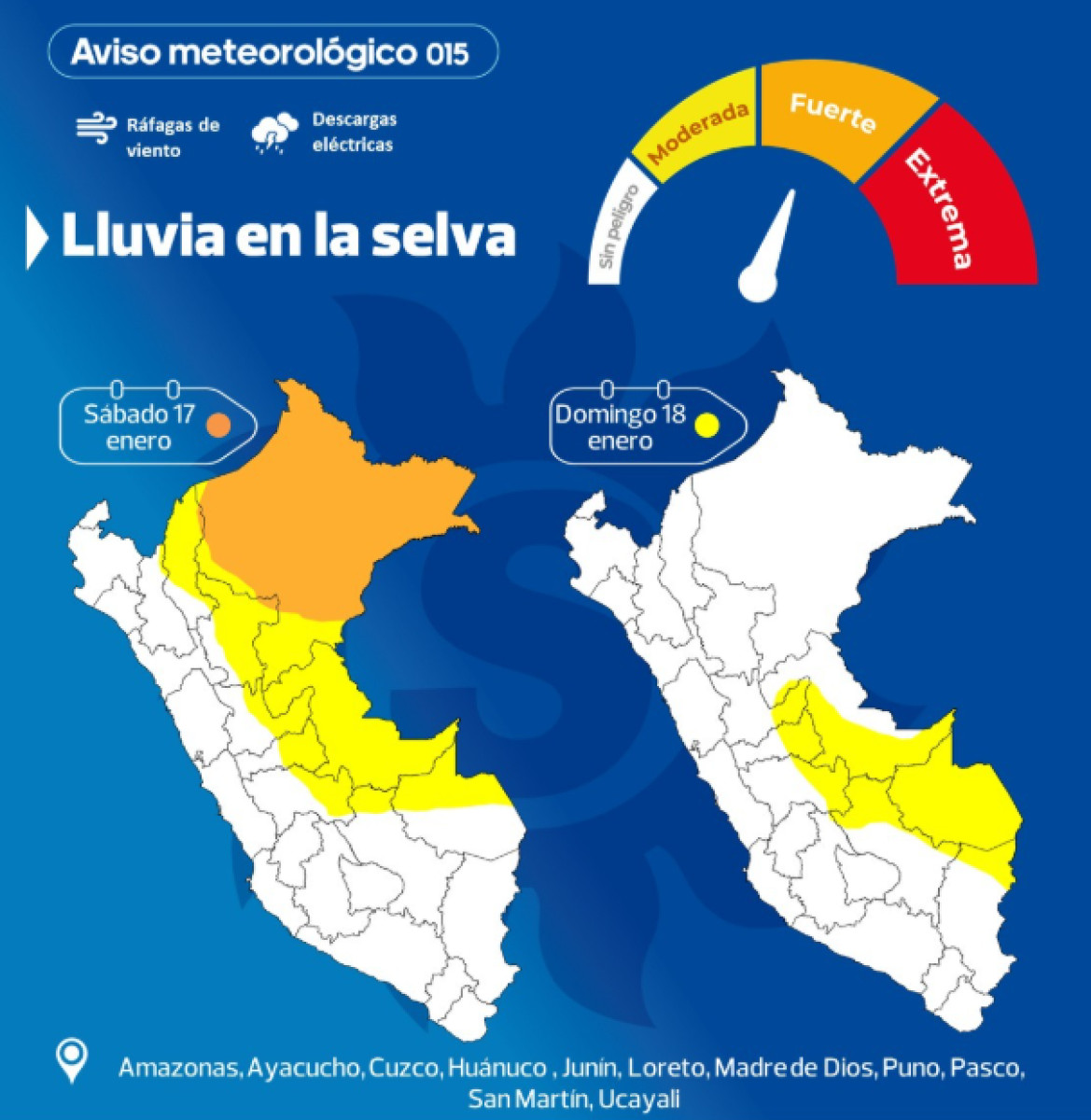 De acuerdo con el Senamhi, se espera la presencia de lluvias en la selva desde el 17 al 18 de enero. Las regiones afectadas serán Amazonas, Ayacucho, Cusco, Junín, Loreto, Madre de Dios, Puno, Pasco, San Martín y Ucayali.