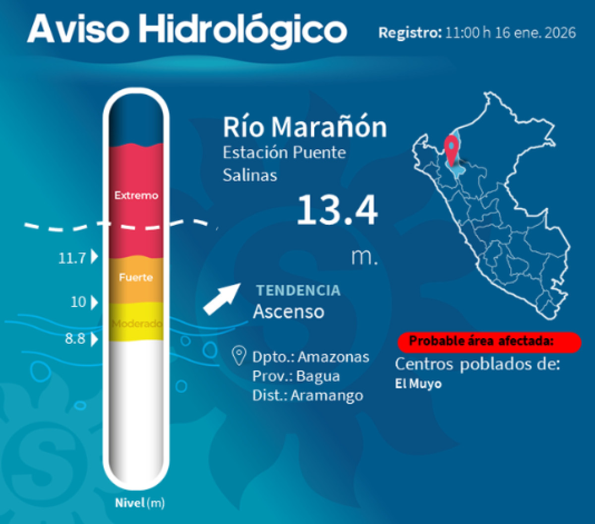 Según las proyecciones hidrológicas y el análisis del comportamiento diario del nivel del río, la entidad prevé que esta tendencia continúe, pudiendo alcanzar la “Alerta Hidrológica Roja” en un periodo aproximado de 3 a 4 días. La situación podría generar inundaciones que afectarían principalmente a los distritos de Pampa Hermosa, Vargas Guerra e Inahuaya, así como a zonas agrícolas y sectores bajos de la ciudad de Contamana.