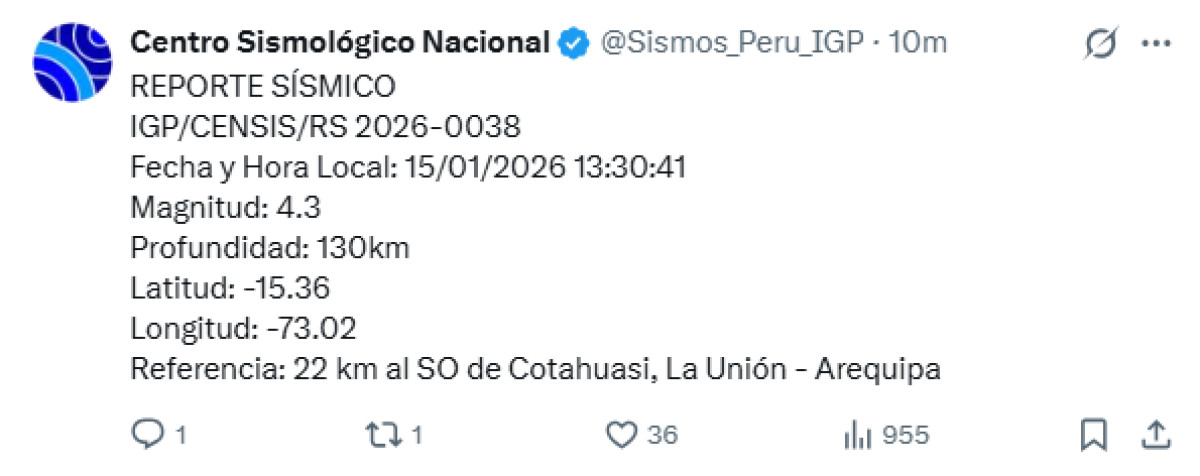 Un sismo de magnitud 4,3 se registró a 22 kilómetros al suroeste de Catahuasi, La Unión, Arequipa. El movimiento telúrico, que se registró este 15 de enero, tuvo una profundidad de 130 kilómetros, según la información brindada en X por el IGP.