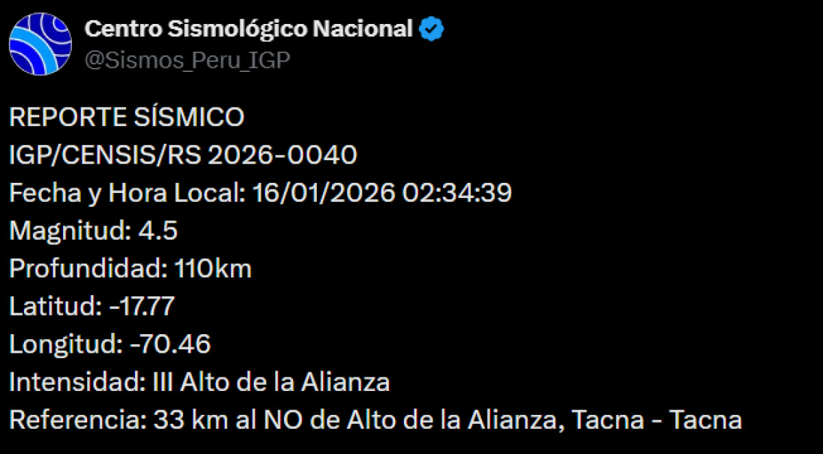 Un sismo de magnitud 4,5 se registró a las 02:34 a. m. a 33 kilómetros al noroeste de Alto de la Alianza, Tacna - Tacna. El temblor del 16 de enero de 2026, se registró a una profundidad de 110 kilómetros, según informó el Instituto Geofísico del Perú (IGP) vía X. Recuerda tener siempre lista una mochila de emergencia para estar preparado ante un desastre natural.