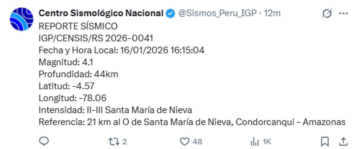 Un sismo de magnitud 4,1 se registró a las 16:15. p.m. 21 kilómetros al oeste de Santa María de Nieva, Condorcanqui, Amazonas. El temblor del 16 de enero de 2026, se registró a una profundidad de 110 kilómetros, según informó el Instituto Geofísico del Perú (IGP) vía X. Recuerda tener siempre lista una mochila de emergencia para estar preparado ante un desastre natural.