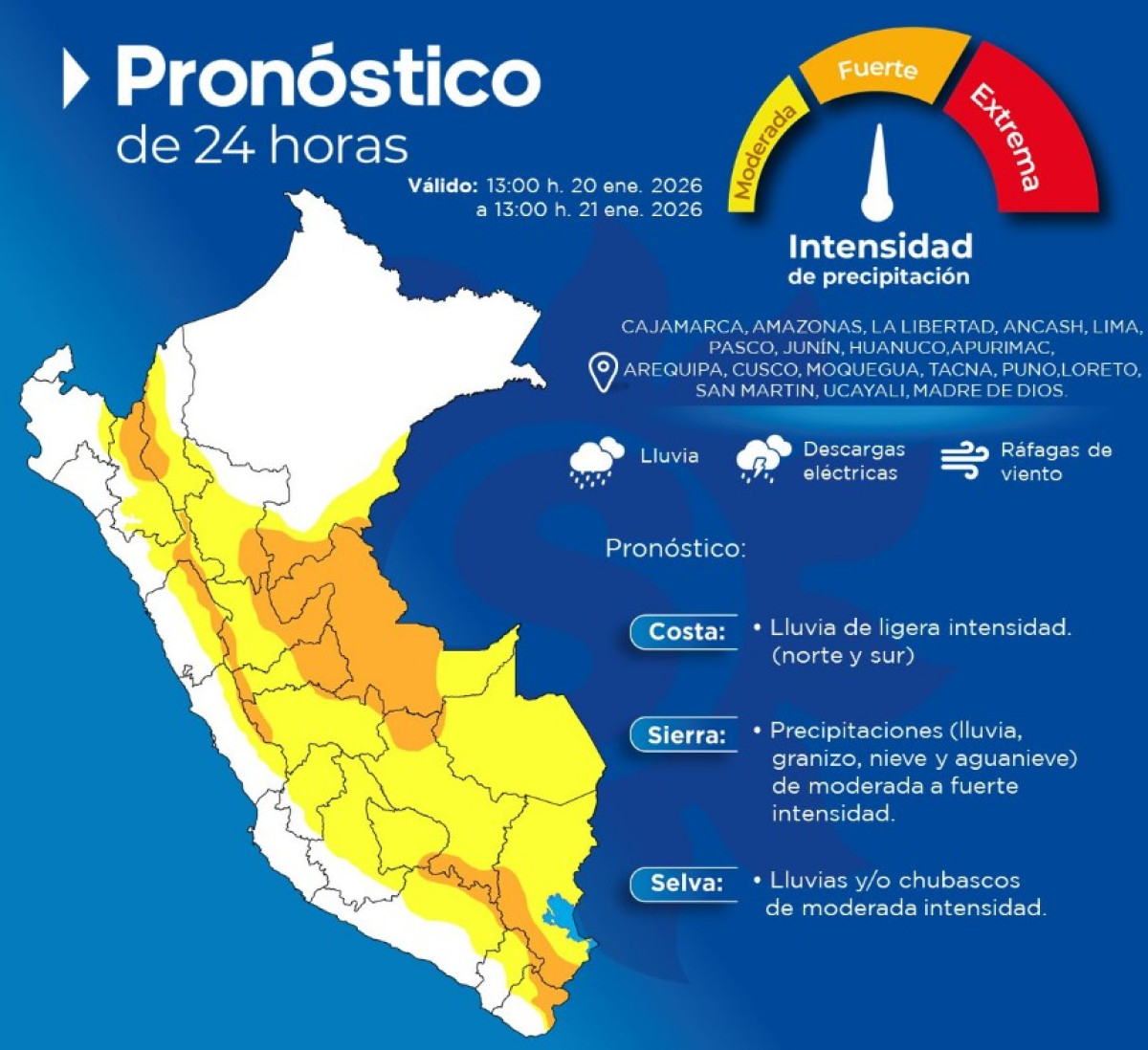 En la selva se esperan lluvias y en la sierra precipitaciones (lluvia, granizo, nieve y aguanieve), de moderada a fuerte intensidad, acompañadas de descargas eléctricas y ráfagas de viento.