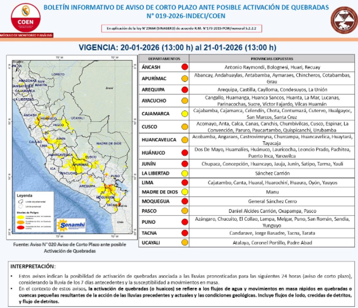 El COEN informó que la activación de quebradas a nivel rojo se presentaría hasta el 21/01 en varias provincias de los departamentos de Áncash, Arequipa, Huánuco, Junín, Lima, Moquegua, Puno y Tacna, según aviso de corto plazo del Senamhi.