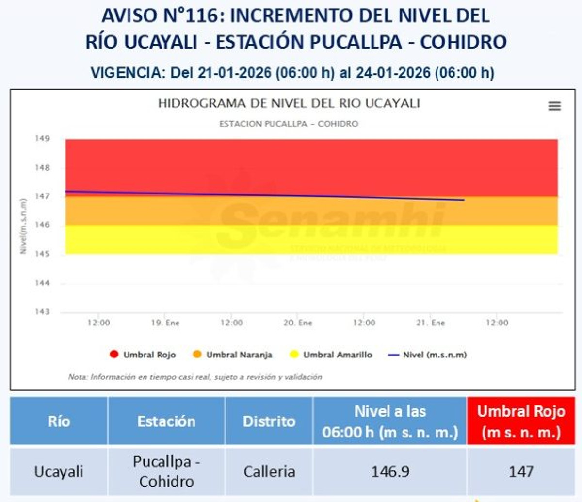 El río Ucayali alcanzó un nivel de 146.9 metros sobre el nivel del mar en la estación hidrológica Pucallpa–Cohidro, en la región Ucayali, ubicándose en umbral naranja, según el monitoreo hidrológico. De acuerdo con las proyecciones, esta situación se mantendría hasta el sábado 24.