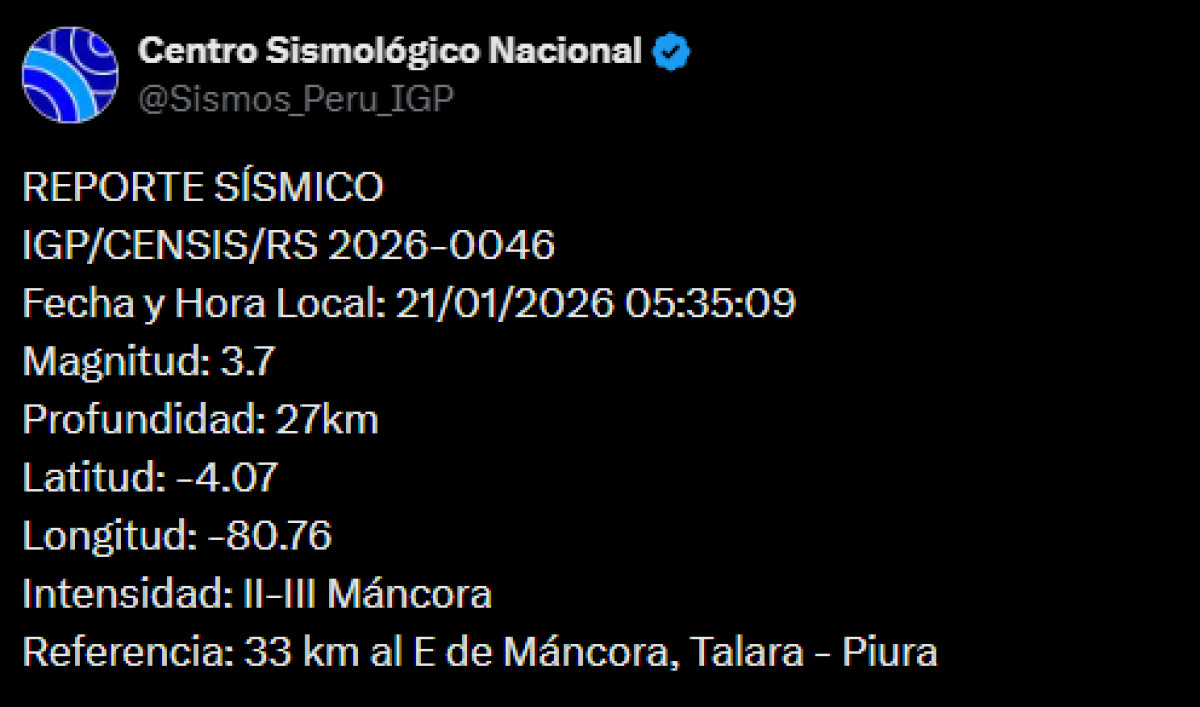 A las 05:35 a.m. de este miércoles 21 de enero, Piura registró un sismo de magnitud 3,7. El epicentro se dio a 33 km al este de Máncora, Talara, según el Centro Sismológico Nacional.