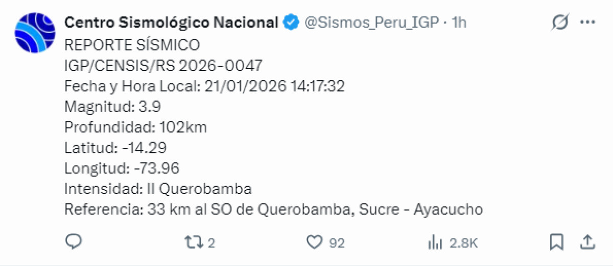 Un temblor de magnitud 3,9 se registró a las 14:17 p. m. a 33 kilómetros al suroeste de Querobamba, Sucre, Ayacucho. El temblor del 21 de enero de 2026, se registró a una profundidad de 102 kilómetros, según informó el Instituto Geofísico del Perú (IGP) vía Twitter. Recuerda tener siempre lista una mochila de emergencia para estar preparado ante un desastre natural.