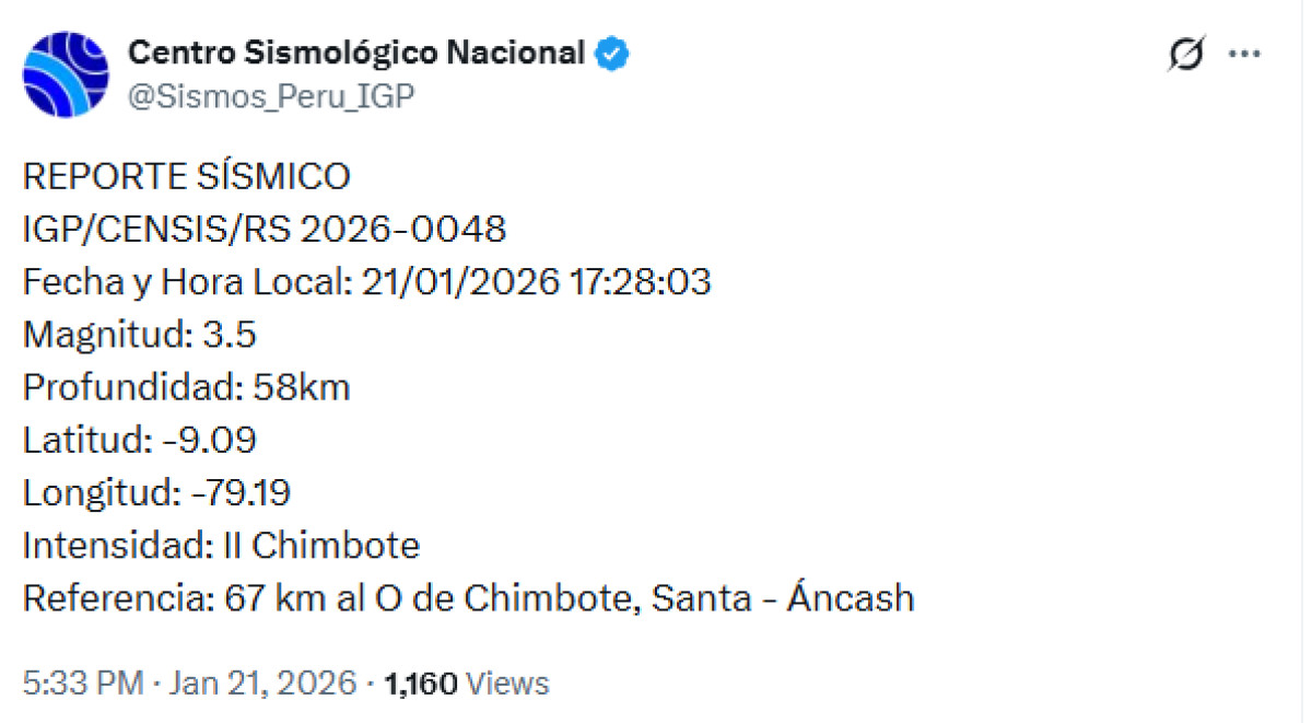 Un temblor de magnitud 3,5 se registró a las 17:28 p. m. a 67 kilómetros al oeste de Chimbote, Santa, Áncash. El temblor del 21 de enero de 2026, se registró a una profundidad de 58 kilómetros, según informó el Instituto Geofísico del Perú (IGP) vía Twitter. Recuerda tener siempre lista una mochila de emergencia para estar preparado ante un desastre natural.